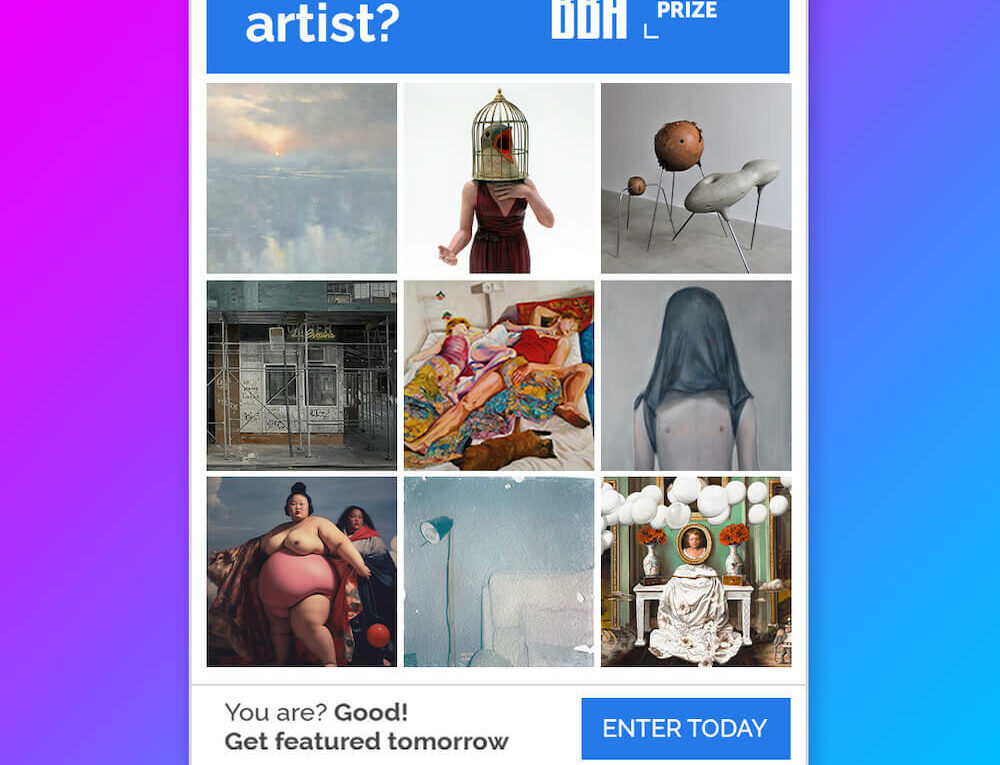 The annual prizes that you’ll find on this site may just be the start of your journey with us. We seriously consider all entries for gallery representation – from the longlisted to winners. You can see proof of this on our gallery website, and even if we don’t choose to represent you, we aim to work with you after your solo show the best we can.